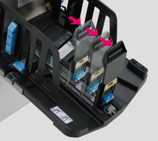 The receiving tray can be adjusted easily with a click feeling for each standard paper size. Improved design allows printed papers to settle in an orderly way for smooth pickup.