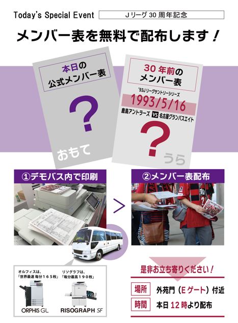 またJリーグ30周年を記念し、スターティングメンバー表の裏面には、30年前の1993年5月16日に実施されたJリーグ開幕戦(鹿島アントラーズ vs 名古屋グランパスエイト)の当時のスターティングメンバー表が印刷されています。