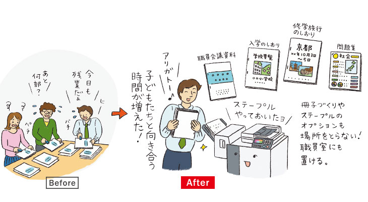 高速カラープリンター「オルフィス」は、写真やグラフなどを使った教材も気軽にカラープリントでき、多くの学校で大活躍。そのほかさまざまな機能で「先生の働き方改革」を強力にサポートしています。
