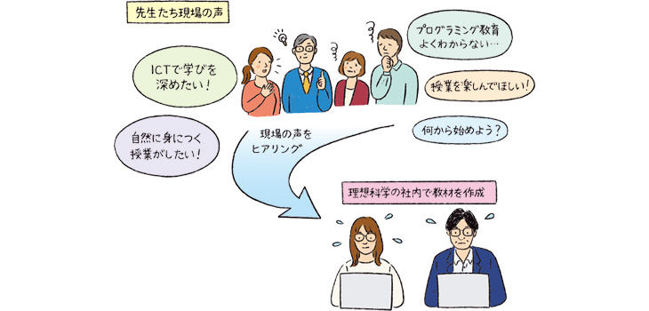 先生方のアドバイスを参考にしながら、一つひとつの教材を社内で作成。先生方のアイデアや工夫も随所に反映された内容となっています。他とどう違う?理想科学ならではのデジタル教材