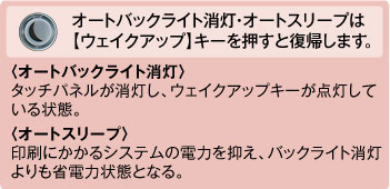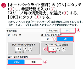 オルフィスFT/FWU/FWの省電力設定で「オートバックライト消灯」と「オートスリープ」の設定、「タイマー設定」の設定ができます。