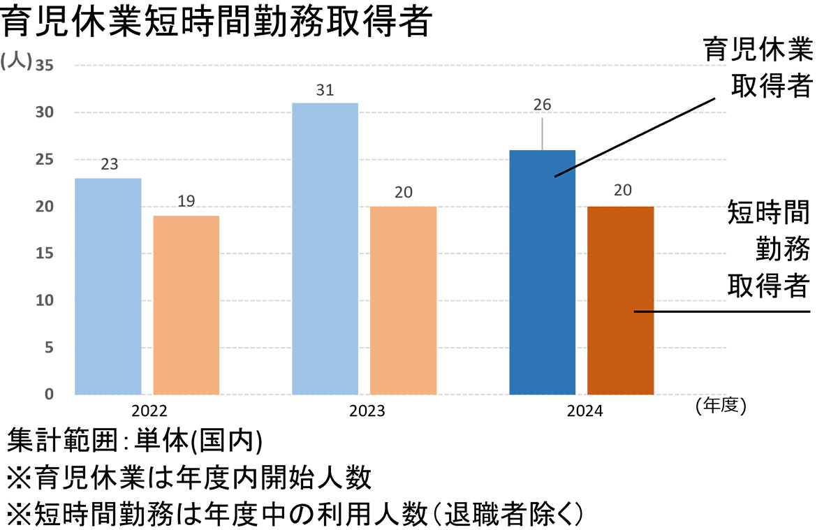 1992年に「育児休業制度」を設け、女性・男性社員ともに活用できる環境を整備しています。また、3歳未満の子を持つ社員は、勤務の時間や開始時刻を変更できる「短時間勤務制度」を利用することができ、育児と仕事の両立を支援しています。2024年度の育児休業制度の利用者は、26名(うち男性18名)です。また短時間勤務制度は、20名の社員が利用しました。
