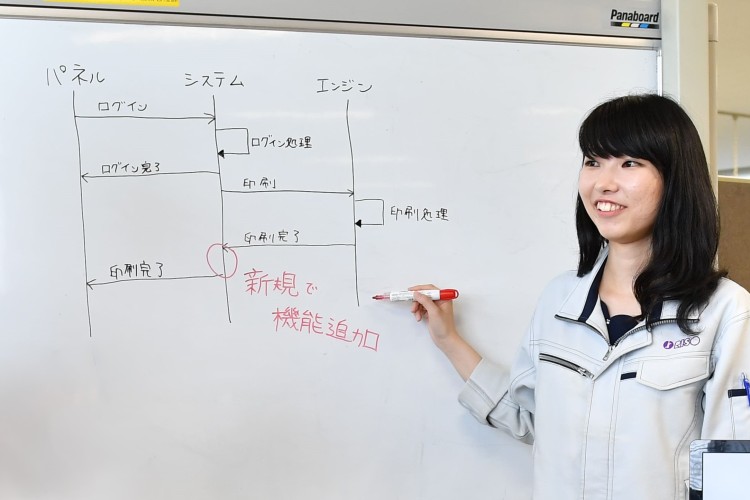 当社製品には、プリンターに接続することでプリント後の3つ折り加工から、封入封かんまでをワンストップで実施できるメーリングフィニッシャーがあります。私は、メーリングフィニッシャーに関する、アプリケーションの開発に携わったことがあります。以前は、A4サイズや封筒サイズなど、ページごとに出力する用紙サイズをお客様ご自身でパソコン上から指示する必要がありました。新しく開発したアプリケーションにより、原稿作成時に自動的に出力したい用紙サイズを指定できるようになったので、お客様の操作が簡単になりました。