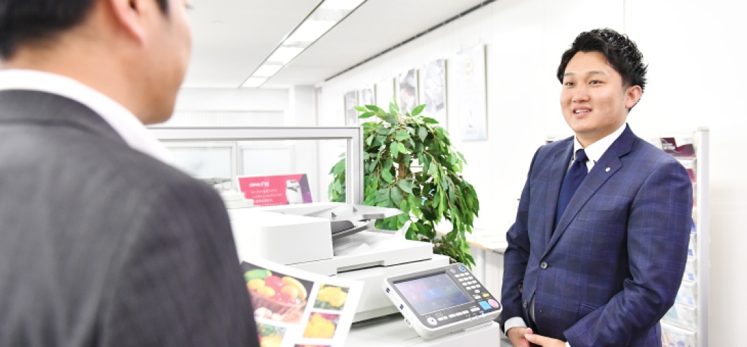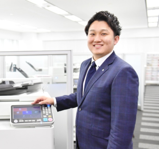 私は池袋支店で直販営業として、2年目から1つの区を任せてもらい、そこから徐々に広いエリアを担当させてもらえるようになりました。現在担当しているエリアは教育機関が多く、学校で配られる学年だよりや教材などの印刷に毎日活用されています。実際に印刷機を使用する先生方とお話をすることができ、営業職としての楽しさを感じています。
