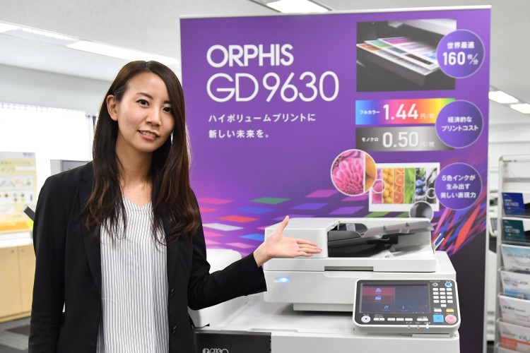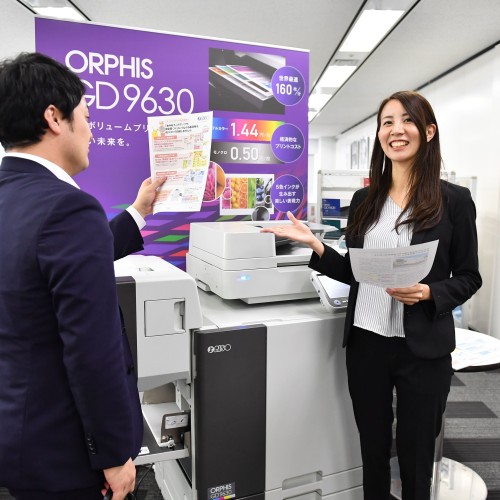 私はまず、福岡支店で5年間営業職として働いたあと、東京本社の営業統括部に異動となりました。営業統括部は、営業部門が「オルフィス」「リソグラフ」などの製品をお客様に向けてご提案や販売しやすくするために、さまざまな施策を企画・立案する部門です。各営業拠点にいる営業社員の手助けとなるような印刷見本などの販売促進ツールを作成したり、モチベーションを高めるための報奨旅行などのキャンペーンを企画、お客様の導入事例を活かした販売促進を担当しています。