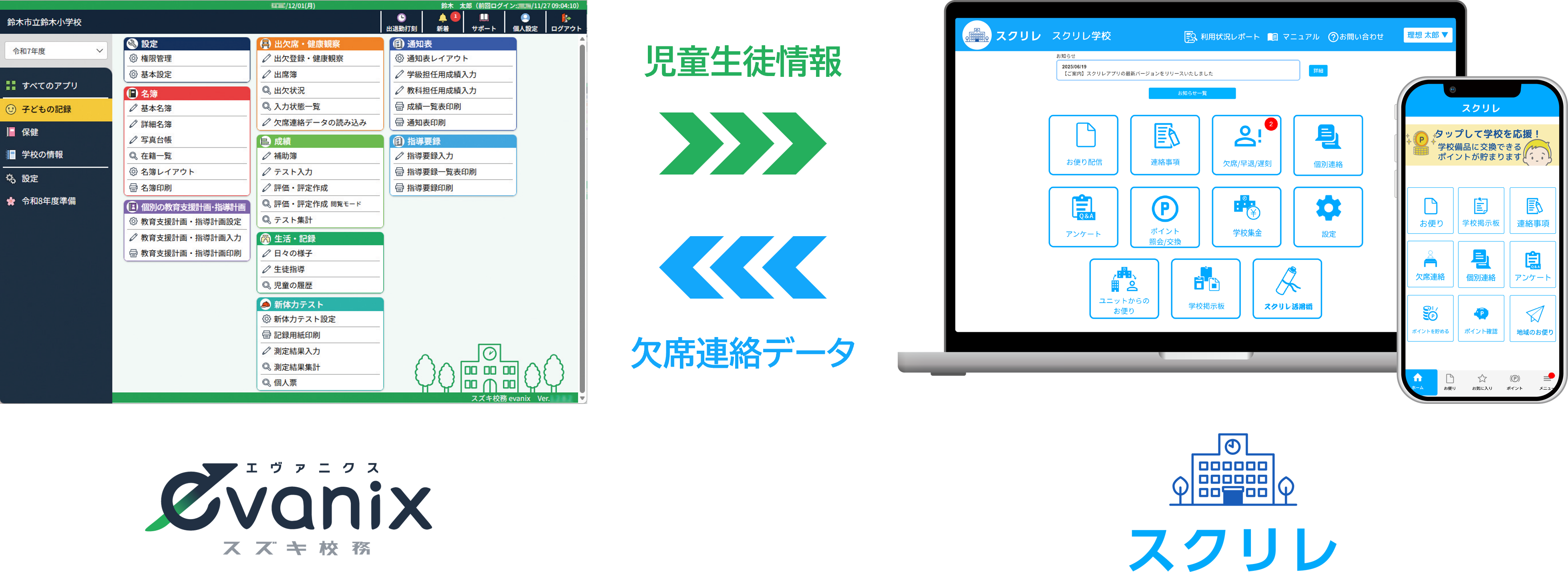 こうした課題を解決するため、3,300校※2以上の導入実績を持つ連絡ツール「スクリレ」と、全国の小中学校で使われてきた統合型校務支援システム「スズキ校務シリーズ」をWebアプリ化したクラウドサービス「evanix」のシステム連携を実現しました。